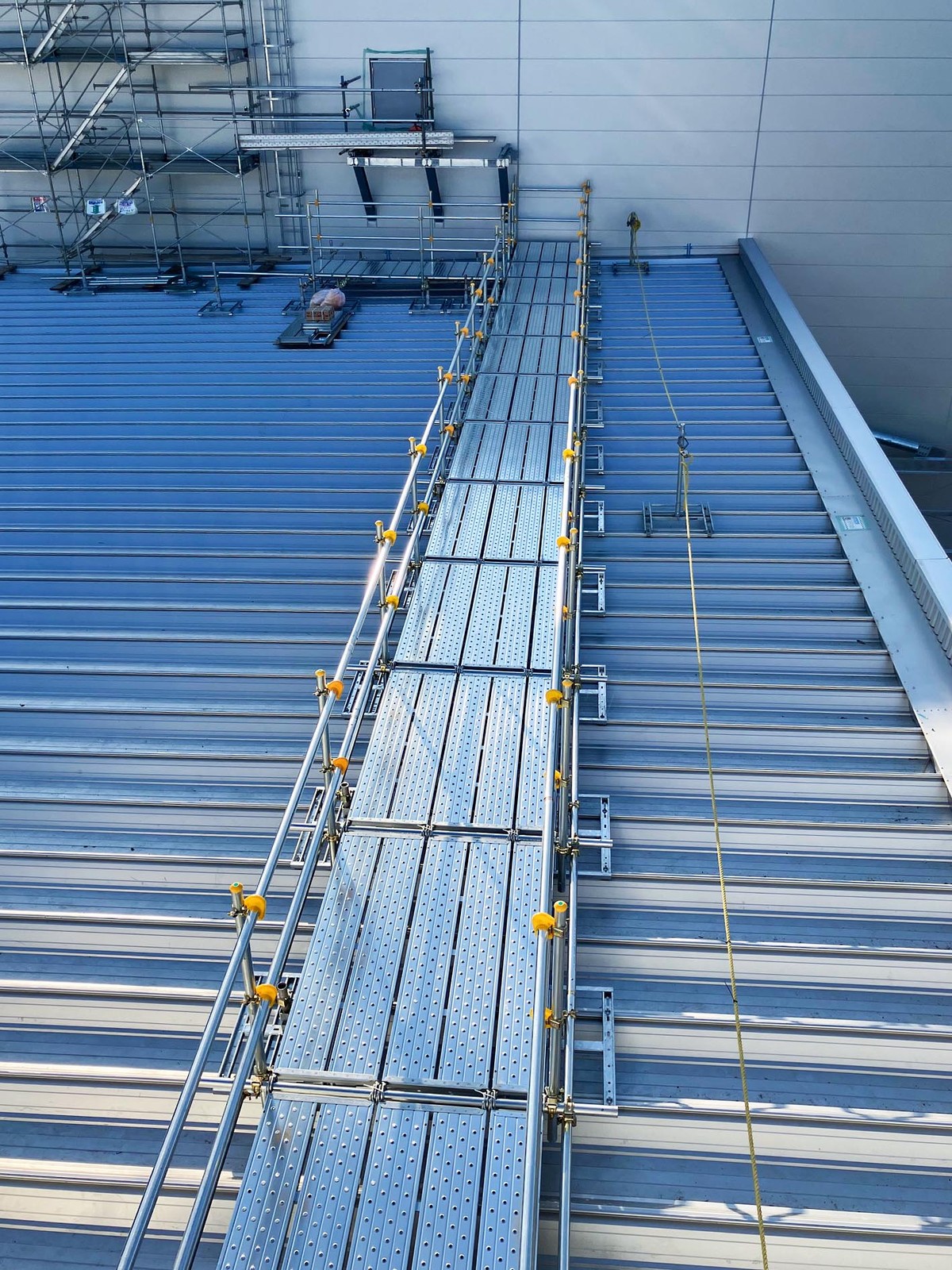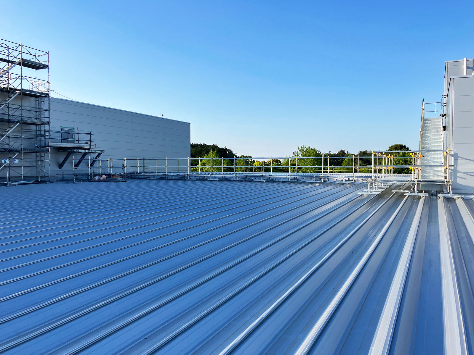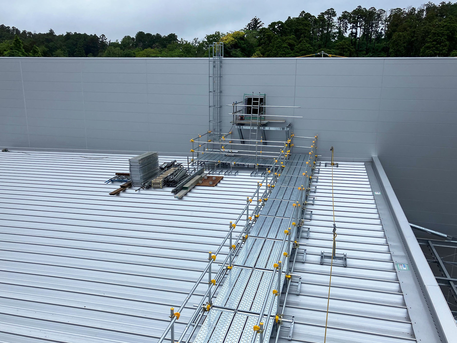 ルーフキャッチャーを折板屋根もしくはコンクリートスラブにハゼ金具やアンカーを使用して固定します。設置後、単管パイプを渡して歩み板を取付け、パイプ支柱に手すりを設置することで、安全に歩行することが可能になります。なお、足場の作業床と屋根面の高さが違う場合でも足場ステップを設置し手すりを取り付けることが可能です。(二次補強は必要になります)